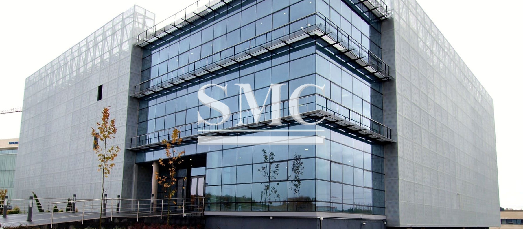 A curtain wall is defined as thin, usually aluminum-framed wall, containing in-fills of glass, metal panels, or thin stone. The framing is attached to the building structure and does not carry the floor or roof loads of the building.
