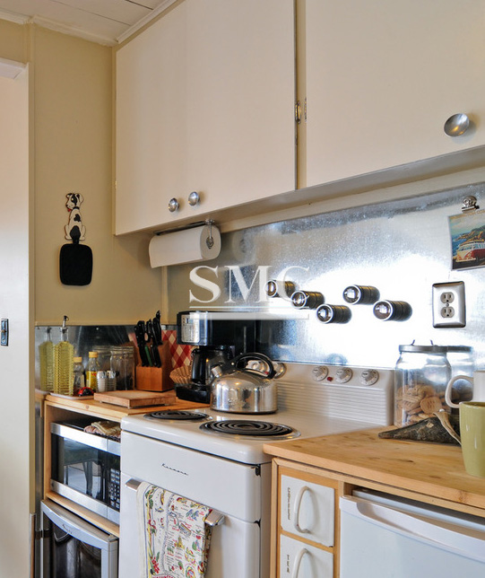 until Joel can match the original Formica on the kitchen island. The wall is covered with a galvanized sheet metal panel, and magnetic jars