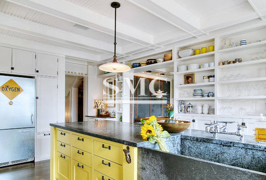 Joel built the lower cabinets from recycled art crates and also rebuilt some of the uppers. The wood counter tops are temporary placeholders
